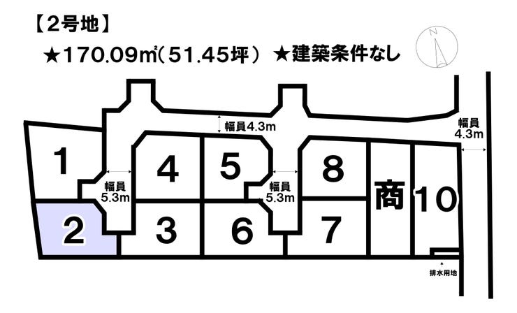 土地面積 170.09㎡(51.45坪) 接道 東側幅 約5.3m 間口 約8.46m